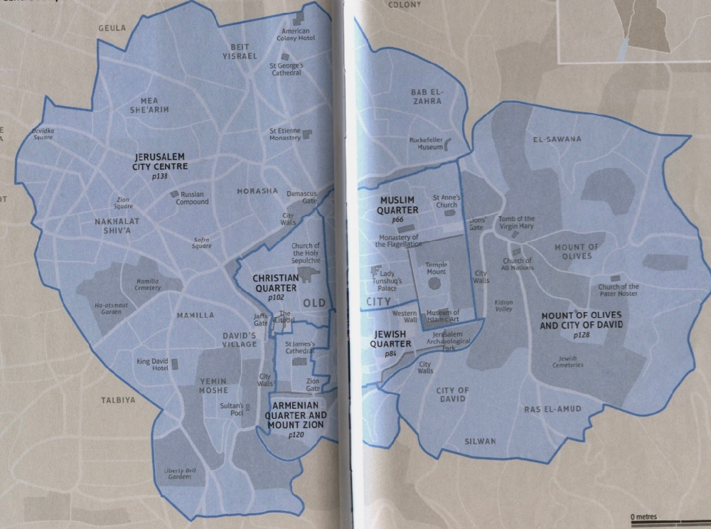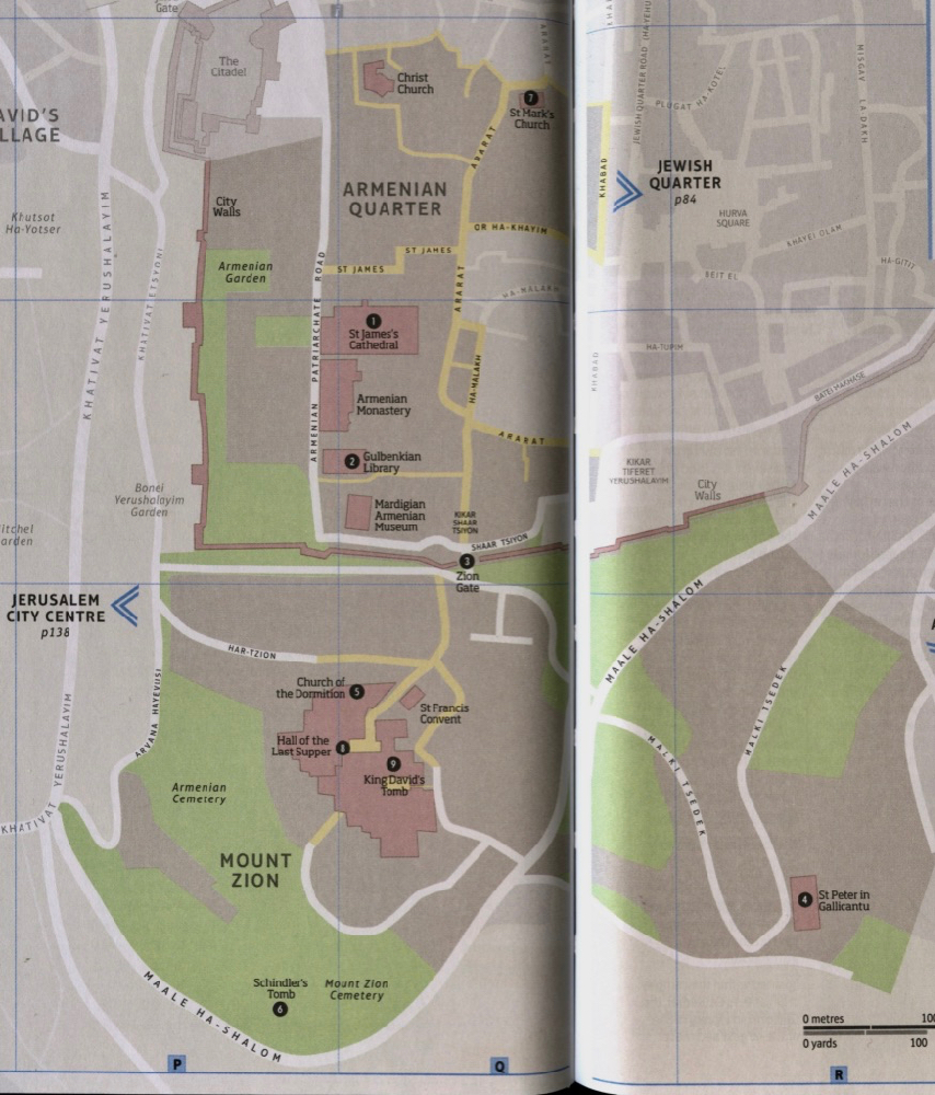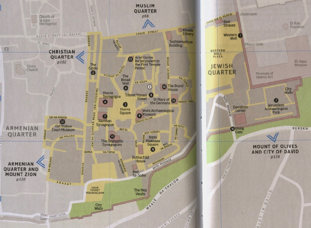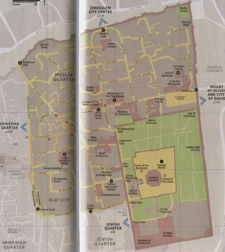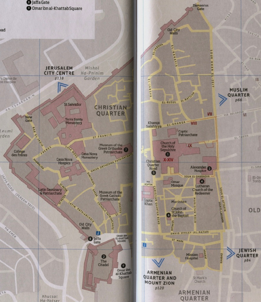 Jerusalem is, of course, a sacred site for the world's three major monothestic religions: Christianity, Islam, and Judaism. The Old City is divided into four quarters: Armenian, Christian, Jewish, and Muslim. These represent a 19th-century cartographic partition, into four quarters, that represented the historical development of a city that had previously been divided into many more areas and neighborhoods. The Armenian, Christian, and Jewish Quarters are open to all. The Muslim Quarter is restricted to only those of the Islamic faith. The maps below show the City and Old City of Jerusalem and each of the Quarters with important places noted. Red Roman numerals on the various maps indicate the locations of the Stations of the Cross.