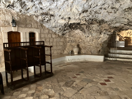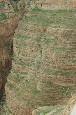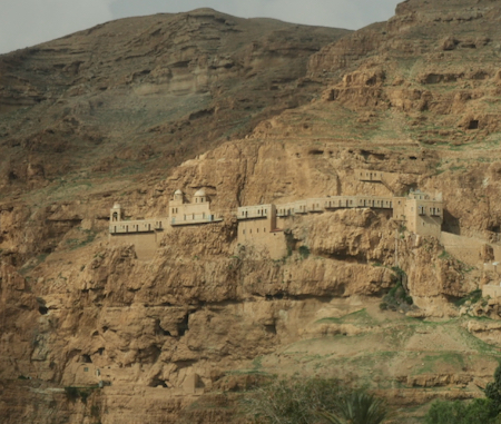 Today was another optional tour and we all signed on. Our bus took us to a cable car (four sets of three 6- to 8-passenger gondolas) for the lift up the Mount of Temptation where Jesus fasted and prayed for 40 nights. At the top station we walked the path up more than 100 steps to the Greek Orthodox Church that houses the cave cut into the limestone where Jesus lived and the rock on which he sat and prayed. (This actually might be true.) The church was originally built in 340 CE and rebuilt by Greece in the 19th c. The icons in the church were brought from Greece. There are cells for 25 monks but only two monks live and pray here now. Herod had another castle on the very top of the mountain called the Doq. “A fortress built by the Seleucids called "Doq" stood at the summit of the mountain. It was captured by the Hasmoneans and it was here that Simon Maccabaeus was murdered by his son-in-law Ptolemy.” (Wikipedia,org) The views to Jericho and the Dead Sea and across to Mt. Nebo, where we stood a year ago, were spectacular. There is a lot of green farmland along the Jordan River.