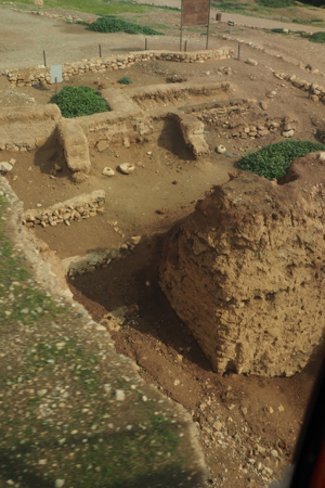 Next we went to Hisham’s Palace. Hisham was the Caliph in 742 when the palace was built but it was destroyed in the 749 earthquake that also destroyed Jericho. Hisham’s Palace lay covered in desert sand for 1,000 years. In 1937 archaeologists digging in the area uncovered part of the 839 square meters of mosaic floors. Over nine million little squares in 21 colors created many different geometric designs and we wandered among the large assembly hall, rooms, women’s mosque, baths, swimming pool, and a large mosque. The “largest in the world” mosaic floor in the assembly hall is covered with a structure built by the Japanese to preserve the mosaics and allow visitors to see all of it. It cost $12 million and was completed in 2021. There are twelve large pillars inside the hall and niches or alcoves in the walls for oil lamps to provide light. This is another ancient site with communal toilets. Outside there is an ancient grape press where people stomped the grapes and the juice ran off into vats like cisterns. There are the foundations of many rooms where the workers lived and a well that held water from Elijah’s Spring. Abbasid era houses were added in the 750 to 850s AD and several stables. We walked around it all. Someone with a sense of humor built an 8 foot square replica of Hisham’s Palace and placed it four feet off the ground. You can duck under and stick your head up through one of two holes and look at the inside of the audience hall. We also stuck our heads into the one room museum with a few of the items found at this dig.