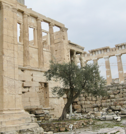 The most sacred moria tree stands in front of the ancient temple of Erechtheion. Thought to be the same location of the very first olive tree given to Athens by the Greek goddess Athena.
