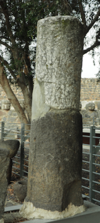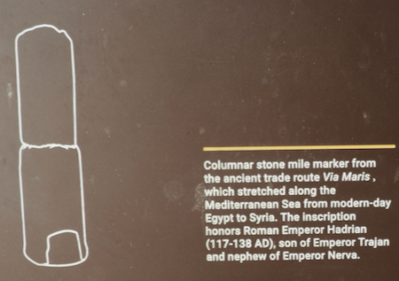 Columnar stone mile marker from the ancient trade route Via Maris, which stretched along the Mediterranean from modern-day Egypt to Syria. The inscription honors Roman Emperor Hadrian.