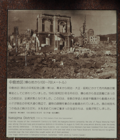After lunch we walked to the Hiroshima Peace Memorial Park. The park is adjacent to the T-Bridge that was the target for the Enola Gay, the plane that dropped the first atomic bomb. The Park is built at the location where the bomb detonated.