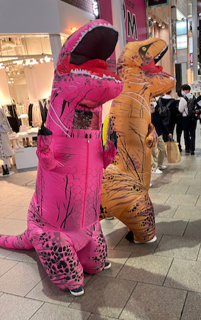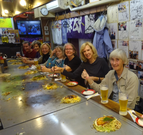In the evening we walked to dinner. Since this is Halloween Night the local teenagers were out cruising the pedestrian shopping street. About half were in costumes - French maids, black cats, judo wrestlers, etc. and most often, two or three or four were all dressed in the same costume. The blow up dragons were the best! After several blocks of these crowds we arrived at a dive on the third floor to have Hiroshima Okonomiyaki.