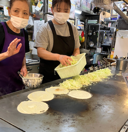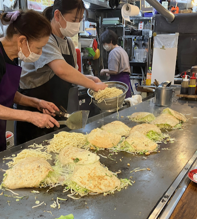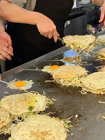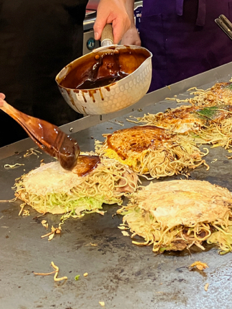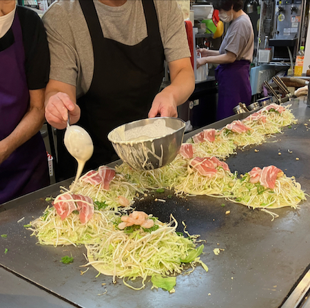 A crepe-like batter (Japanese pancake) is poured onto a grill. Then shredded cabbage is heaped on, then tempura crisps, green onions, bean sprouts, shrimp or bacon, Udon noodles, egg, a purple sauce, and seaweed on top. The whole thing is then flipped over. The pile is pushed toward your plate and you use a spatula to cut it and move it from the grill to a small plate and eat it with chopsticks. The pile stays hot and it is delicious.