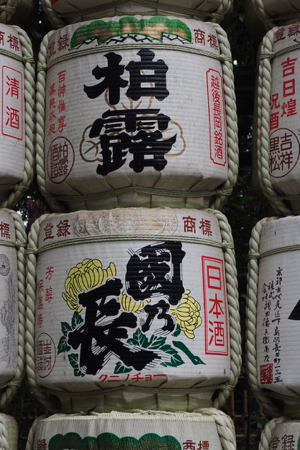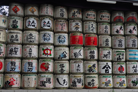 Saki barrels donated to the Shrine by brewers - decoration of barrels signifies a spiritual connection between brewers and shrines for prosperity (see link for further explanation.)