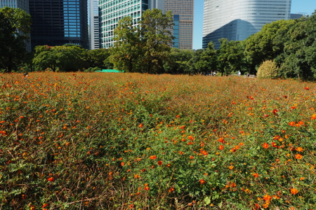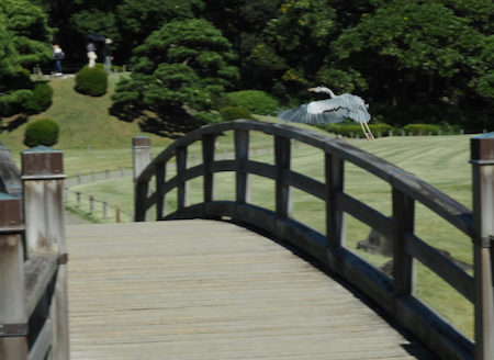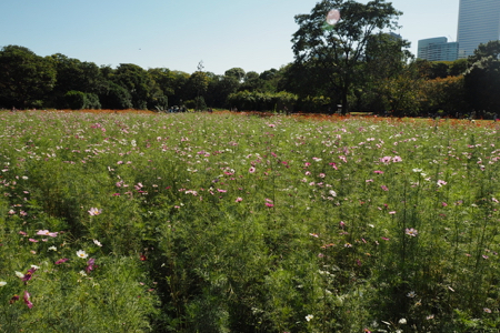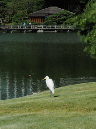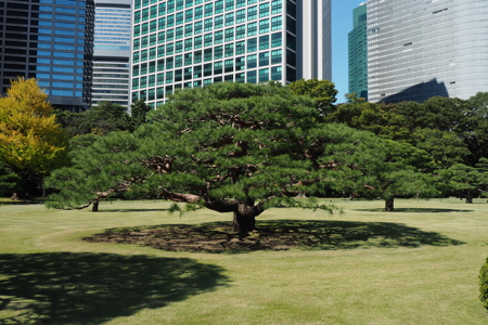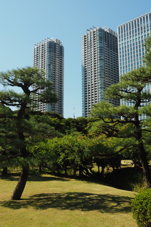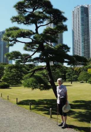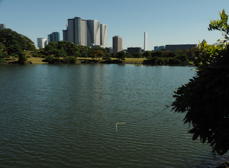 Today we took a day off from our group. They went to the drum demonstration and then walked in the Asakusa area of Tokyo that we did two weeks ago. Instead, we went out for a walk to take some pictures and then to stroll around the Hama-rikyu Garden. This area was the family garden of the 17th c. Tokugawa Shogun. It is only about a half mile from our hotel and was lovely on this sunny 68° day.In 1868 the gardens became one of the homes for the Imperial family and in 1952 it was declared by the government to be a National “Place of Special Scenic Beauty” and that is an apt description. There are beautifully manicured lawns and trees shaped like full-sized bonsai. There are some tea houses, decorative ponds, bridges, wisteria trellises, a small Shinto shrine, fields of marigolds and cosmos, a plum orchard, a peony garden, duck blinds called Kamoha, where falconers or peasants with nets on poles caught wild ducks. We enjoyed watching herons, cormorants, egrets, and ducks around the three large ponds. The garden was very Japanese and delightful.