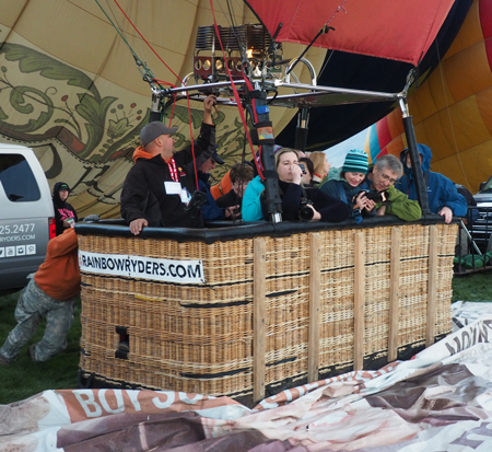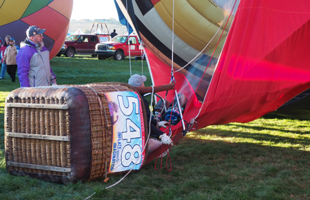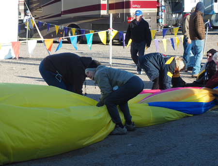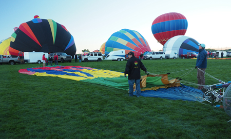 On Tuesday, at least 12 balloons landed in the rough grass behind the Fantasy RV tent but one came down right in the street in front of the tent. “Sunnyside Up” was piloted by a woman from Illinois and she solicited our help to hold down her basket and lay down her “envelope” (the balloon.) Gale got to crew the entire process. She was so nice and calmly gave us instructions. It was so much fun.