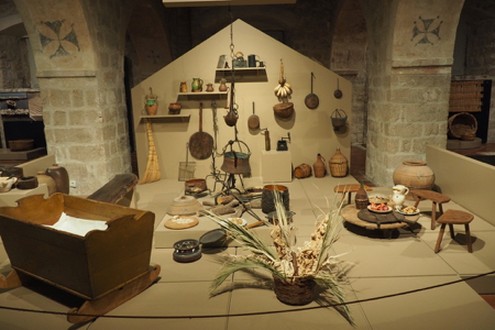 Continuing our tour of the old town, we used our map and found the granary which is now the Ethnographic Museum. It was a gem! The first floor had an exhibit entitled Flowers of Adrion. They were color photographs of parts of flowers enlarged to 2x3 foot pictures on cloth. They were clear and bright and wonderful (no photos by us, of course). The second floor had tools for farming, wine making, fishing, kitchen, etc., of the 1700’s. The Dutch stove was fascinating. On the third floor they displayed traditional clothing and jewelry. We enjoyed the museum.