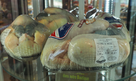Chickens for sale at a toll road stop for lunch. One chicken is 41.62 Euros - more than $42.00 USD