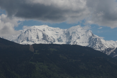 Mont Blanc, the highest peak in Europe (left-center under the large black cloud)