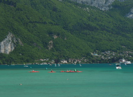 Today's drive took us through the French Alps on some definite "country roads" to Grenoble. Definitely "mountain driving" in some places.The tour included a three hour stop in Annecy, a cute old city on a large lake, Lake Annecy. The lake is 20 km by 4 km (12.4 x 2.5 miles) and the water has been cleared of sewage and factory waste so it is now glacial green and very clear.