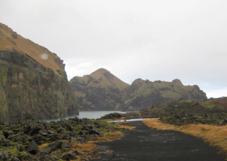 It rained hard all morning and harder after lunch, so Andres got us a shuttle ride up to the Eldheimer Volcano Museum. We watched a documentary film on the 1973 volcanic eruption that continued spewing materials for five months and buried one-third of this city in lava. The US ambassador to Iceland was able to get US ships to arrive with water canons to pour sea water on the hot, moving lava to stop its flow and create a barrier to save the harbor and more of the city's structures. The day before the nighttime eruption, the fishing fleet was in the harbor, due to a bad storm at sea, and they were able to safely evacuate all the people to the mainland (Reykjavik).