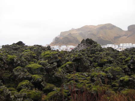 Lava field with town beyond