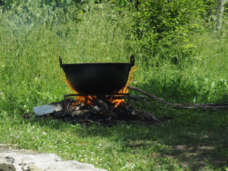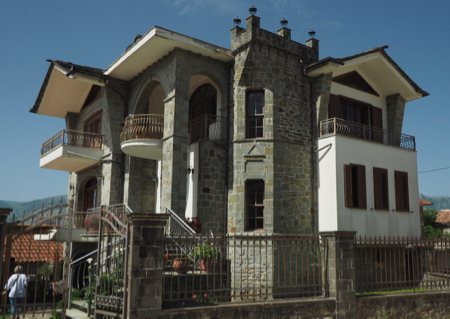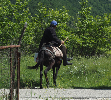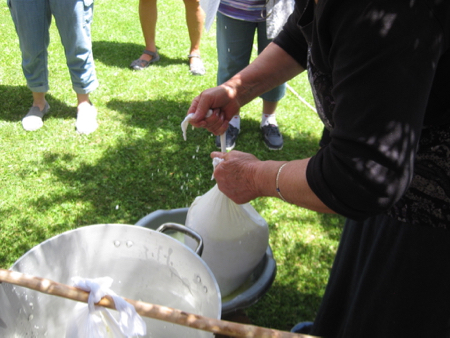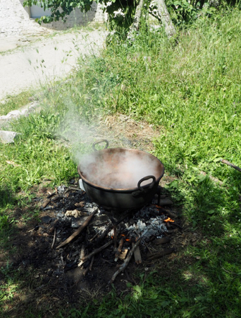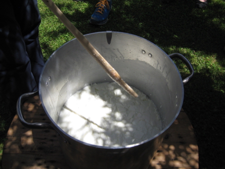 At Lenda's house, a beautiful three-story built in 2003, he showed us the steps in making cheese from a sheep (too fatty) and goat (too hard) blend of milk. We watched it boil in a large copper pot on an open campfire. It cooled, then he added rennet (a yeast powder) and let it sit for 45 minutes. Grandma Katerina then scooped it into cheese cloth to separate the curds from the whey. It would age for at least two days so we ate the cheese the previous OAT group had watched being made.
