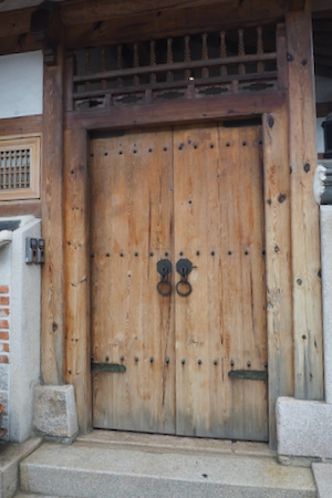 After lunch, the group walked through the Bukchon Hanok Village, an area of old-style houses. It was still raining hard.