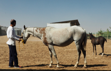 We sat under cover and out of the blowing sand (but visited by hundreds of flies) and watched as handlers led some of the beauties out to show off. Some were golden color and others black, but all had a unique shine. Their manes were cut very short because of the heat. 130° is usual in summer here. The mares were calm and came out with their foals. One foal was only two weeks old. The stallions were much more rambunctious. One foal was an albino with eerie clear eyes. The oldest was a 30-year-old jumper who was a champion at the 1960 Olympics. The stallions were all race winners. One of the gold horses was given to Queen Elizabeth II.