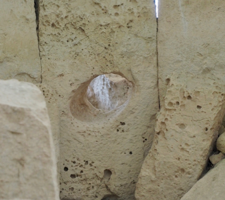 This elliptical hole was hewn out in alignment with the Summer Solstice sunrise. At sunrise, on the first day of summer, the sun’s rays pass through this hole and illuminate a stone slab inside the chamber. (This view is from the inside looking out.)