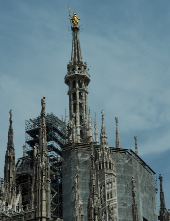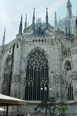 Our brief walking tour began in front of the Teatro alla La Scala and moved on to the Galleria Vittorio Emanuele II, the oldest active shopping gallery (mall) in Italy. The exit at the other end of the Galleria is in front of the very Gothic, very ornate, Duomo - the Cathedral of St. Mary of the Nativity.