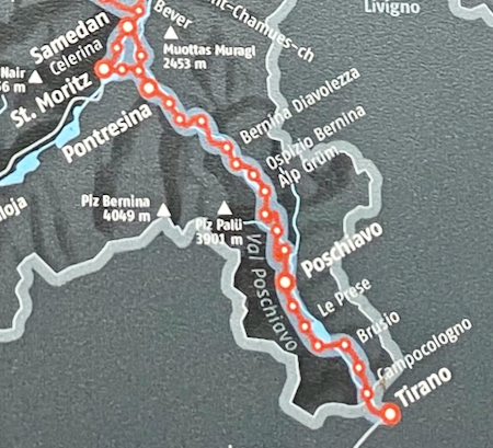 Train lines among the Swiss Alps - our trip was from Tirano (in the lower right) to Bernina Diavolezza (about 2/3 of the way up that line)