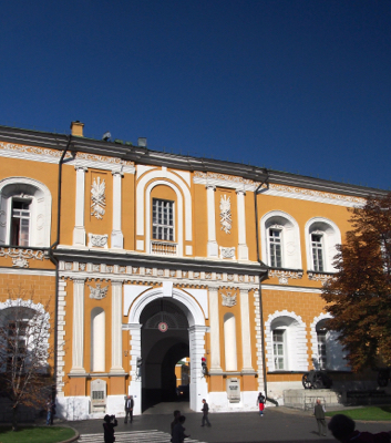 We regrouped and entered the Kremlin for the standard tour. We entered the Kremlin (fortress) walls through the Trinity Gate and walked past the Peter the Great arsenal that is now the barracks for the Presidential Regiment. We looked at the large (second largest in the world) cannon (Tsar cannon) built in 1584 to scare intruders away. Next to it is the Tsar Bell.