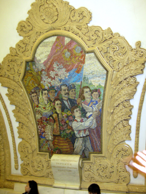 Our day was not over. Migle and Nicholai took us on a ride around the city on the metro/subway. It is a large system with 197 stations on 11 lines and a new station further out is opened nearly every year. Ten million people ride the metro everyday and trains run every 45 to 70 seconds! We stopped and looked at some of the elaborate stations. One station had mosaics on the walls and ceiling of Ukrainian folk festivities. There was a similar station for Belarus with mosaics of industrial workers. Another celebrated the youth department of the Communist Party with happy children in uniforms. We stopped to look at seven stations. All were used as bomb shelters in WWII.
