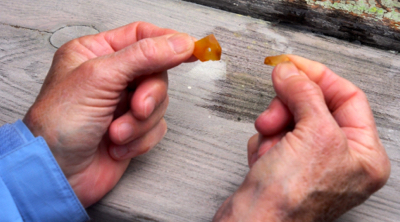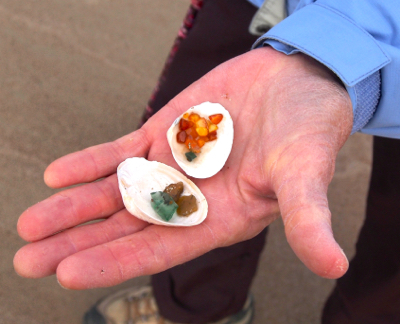 After our lecture we sat outside and were given a nickel sized piece of amber to polish and make into a necklace pendent. We rubbed the stone on emery paper – horizontal, then vertical, and last in circles – to remove the “skin” and reveal the shiny amber beneath. We tied it on a string and wore our new jewelry.