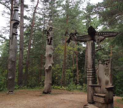We drove through the forest of tall pine trees looking for the moose and wild boar that inhabit the forest – we did not see any. Our next stop was in the town of Juodkrante where we walked the Hill of Witches. In 1979 while under Soviet control, wood carvers were encouraged to carve oak tree trunks into Lithuanian fairy tale characters. There are 80 carvings. Sigrit led our group up and over the hill and told us the fairy tales connected with many of the carvings.