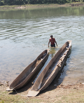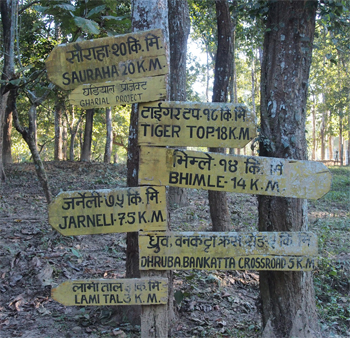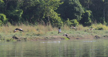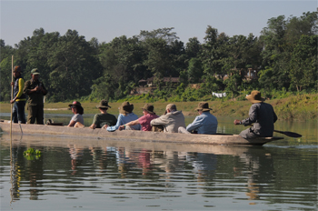In the afternoon we got into narrow dugout canoes made from a Champ tree trunk. Seven of us with a poler in front and a paddler in the back went down the Rapti River. We saw Indian pond herons, Egrets (little and cattle), Siberian ducks that migrated from Siberia by flying over the Himalayas, lap-wing, green sank, pied king fisher, grebe, white crown bug-tail, black ibis, storks, and Asian open bill ducks. We saw a few monkeys and several crocodiles, including the endangered Gharial crocodiles with long skinny snouts.