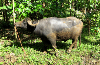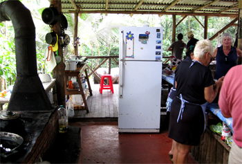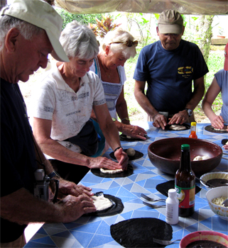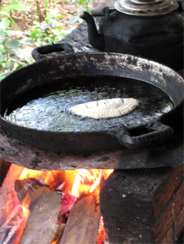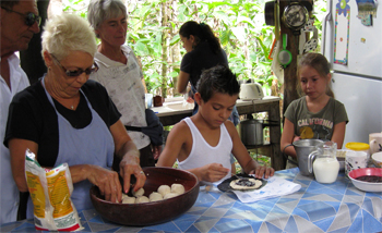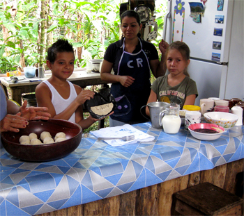 After breakfast we started our local adventures. The first discovery was at the home of a lady with six kids (1 to 16 years old) and the family taught us to make empanadas (turnovers). Their house had a small living room with a TV and four bedrooms not much larger than the beds. The kitchen and dining room were out back and had a roof but no walls, a wood burning stove, a single pipe faucet, one electric line, and a water buffalo tied up in the yard! We made our bean and cheese empanadas from scratch and the mother cooked them in hot oil on the wood stove. They were very good.