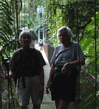 We got back to the hotel with enough time to regroup and then headed out for an optional tour - a two hour rain forest canopy walk - to the Arenal Hanging Bridges - and to see the side of the Arenal volcano where the lava is erupting. The best part of the rain forest walk was watching a bunch of spider monkeys jumping around in the treetops. One monkey had a baby on her back. If a jump was too long for one of the young monkeys, an adult would reach across the gap and the little one would walk across her shoulders. We heard a bunch of howler monkeys but couldn’t see them. We also heard the volcano belch a few times. We saw lots of birds, leaf cutter ants, and all kinds of vegetation. The trail was paved with lattice cinder blocks and had 14 bridges, which were open woven flooring and suspension cables and very high above the ground.