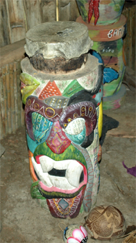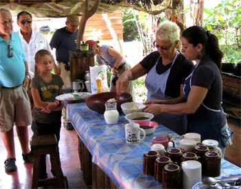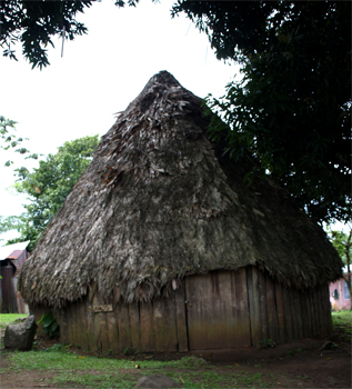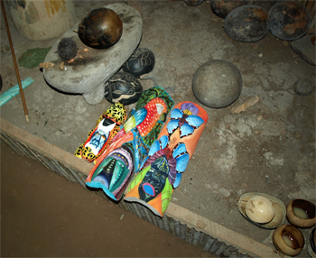 The next stop was at the Maleku indigenous community. We entered a stick and thatch and dirt floor one room structure that they refer to as a “ranch.” This is what the locals of the current generation and earlier lived in. These are now replaced with small cement structures with corrugated metal roofs - and TV antennas attached to a bamboo pole outside. We entered the thatched hut and had a presentation by a 23-year old native. There are about 400 indigenous Maleku and they make the school kids learn the native language and customs as a school subject that must be passed to move to the next grade. She explained (as Leo translated) about the decorated gourds, balsa wood masks, drums and “water” sticks (pebbles inside a bamboo tube that sound like running water when turned upside down). They are made in the community and bring some money to the village. We sampled the native drink, chachi, made of fermented boiled corn, sugar cane, and water. It was something we will not be indulging in!