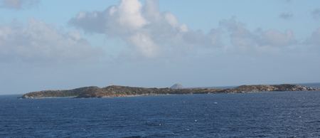 This morning we took our first cruise excursion. We boarded a small catamaran with 28 other guests and three crew and sailed out to Buck Island to do a little snorkeling. The guide pointed out some fish and dove to the bottom (25’) and brought up an anemone. I saw one turtle and some colorful fish and got so cold I “finned” my way back to the boat to dry off and warm up. The water was clear but the reef was all dead. The guides threw out bread crumbs to attract the fish. We shared the cove with at least three other excursion boats.