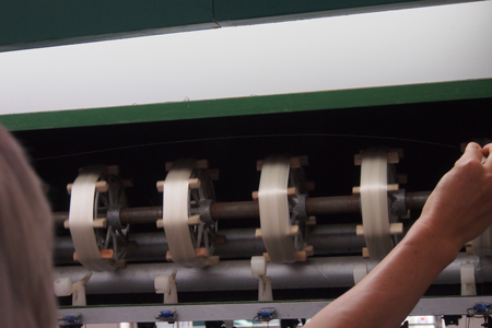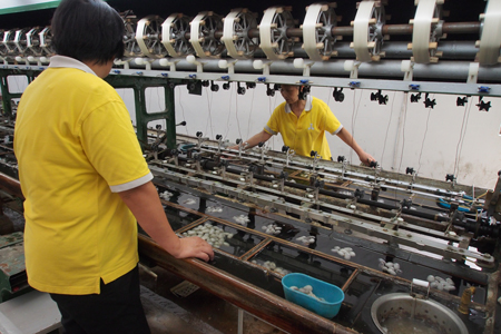 Next we went to a government run silk factory and showroom. The process of using silkworm threads may have been discovered when a cocoon fell into a lady’s cup of tea. As she tried to lift it out, the silk filament began to unwind. Our guide, Charlie, explained the process to us. We looked at silk worms eating mulberry leaves and forming their cocoons on straw structures. The cocoons are then boiled to kill the worm before it makes a hole to get out and breaks the filament of silk in so doing. The filament in one cocoon is about 1.5 km long! The filaments from 8 cocoons are twisted together to make one thread. We watched women working the filaments into threads on a large machine. The process seems simple in theory.