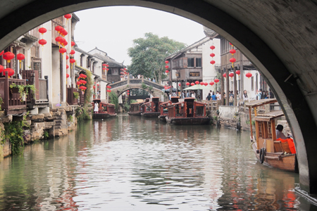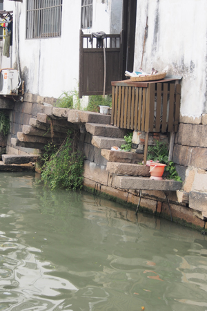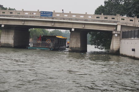 We ate a lunch of 12 dishes on one Lazy Susan and then took a ride on the Grand Canal. The canal was dug by hand 2000 years ago. It runs south from Beijing. It is 1100 miles long and was made to move the Chinese army and supplies south to conquer various enemies. Our dragon-decorated boat took us from the Grand Canal into the Baby Canal (much smaller) within Zuzhou city.