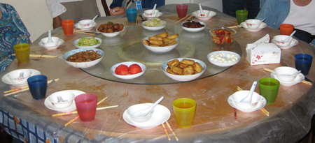 The manager of the center then had us all go to her apartment for a “home-hosted” lunch. Her apartment was small with three bedrooms (one for her and her husband, one for the husband’s mother, and one for her son and daughter-in-law), a dining/living room, a small kitchen (a sink, 2-burner stove, and small counter), and one bathroom. We all sat around a round table with a Lazy Susan and ate about 20 different dishes her daughter spent all day preparing. All of it was good. The apartment and rooms were very small and plain.