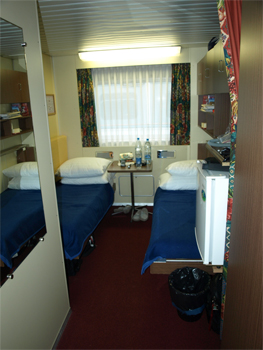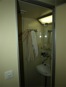 Views of our ship and stateroom. The bathroom was the most interesting feature. It has a unique toilet and small sink. To shower you stand between the toilet and sink, pull a curtain around to protect the toilet and door and use the handheld spray. There was almost room enough to turn around!