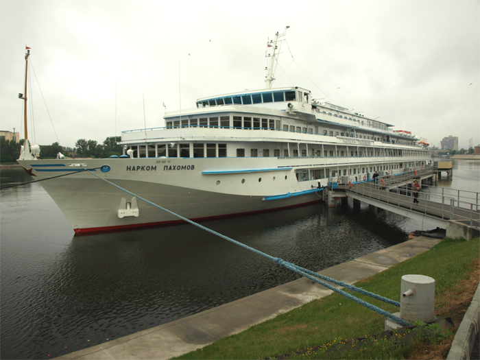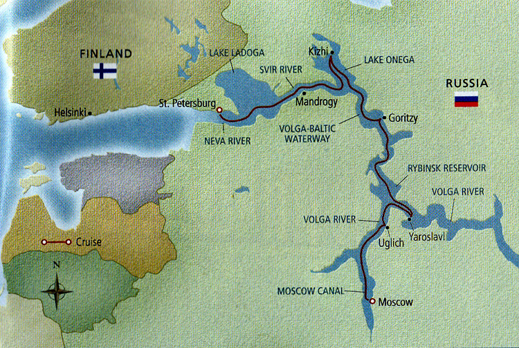 We left home in the rain at 6:30 AM and boarded our first airplane (United) at 10:15 AM. We sat in the plane for 25 extra minutes waiting for people with connections from other delayed flights. Three hours plus in the air to Washington-Dulles. We changed planes to Silver Alliance operated by SAS for the 8 hours to Copenhagen. We had a chicken dinner with complimentary wine, lights out for nap time (ho, ho) and then a continental breakfast. We flew up the east coast, east of the Canadian Maritimes, south of Greenland and Iceland, north of the Faroe Islands and into Copenhagen. We changed planes again and flew to St. Petersburg (sitting in the second to last row of seats behind the kitchen and next to the jet engine) in pouring rain for another 2 hours in the air. We arrived in St Petersburg at about 2 PM their time, which was 4 AM our time. We were met and bussed to our ship, the Viking Pakhomov, got a snack in the Panorama Bar, unpacked in our little stateroom (even smaller than a camper), found our way around the ship, attended an orientation meeting, and had dinner, which consisted of a nice salad bar, a cup of cream of broccoli soup, beef stroganoff with spaetzels or veggie lasagna and chocolate mousse for dessert. It was very good, well presented, and efficiently staffed