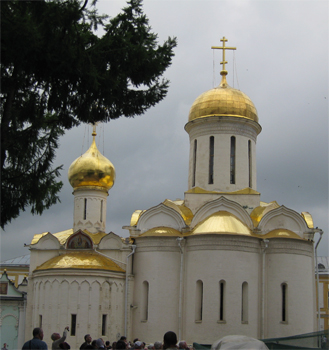 Marge still has her fever and upset stomach and rash and opted to stay home, so I went on the excursion to Sergiev Posad without her. Today the sky is very heavy with rain clouds. Irenya told us that the Russians seed the clouds to keep rain away on national holidays. So Thursday they used 12 military planes that dropped a mix of dried ice, talc, and silver 150 km to the west and then have a sunny hot day for the holiday.
