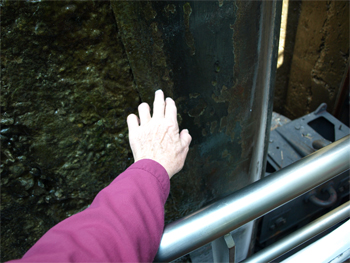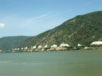 We entered the Djerdap Gorge or the Iron Gates of the Danube. The Danube becomes narrow and deep (90 meters) with limestone rock crags, which form some caves. In 100 CE, Trajian's army had built a road on the Serbian side (on our right gowing down stream) and a marvel of a bridge across the gorge. It was destroyed by the Turks and the dam down river flooded the remaining pillars. There only remains a plaque that was repositioned above the new water level.