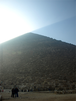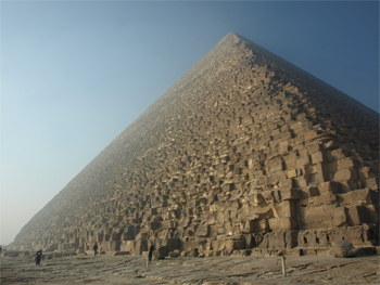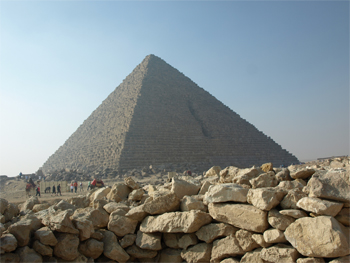 Great Pyramid with people waiting to enter. One of the original entrances to the tomb is above the present tourist entrance. |