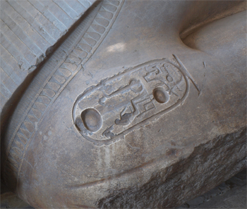 Hieroglyphs on the back of a fake statue of Ramses II |