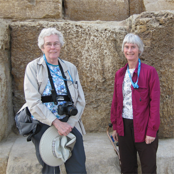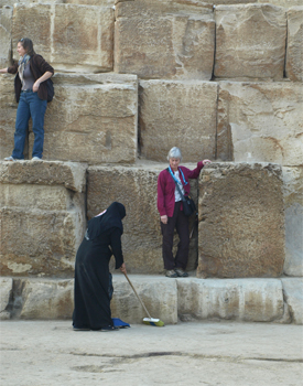 We drove over to the smallest of the three great pyramids and Gale entered it walking down the low, narrow tunnel into the inner chambers and the vault where the sarcophagus would have been if the grave robbers had left anything. There were no decorations on the walls and only the stones that lined the burial chamber were impressive. The ceiling is corbeled and the roof was of inclined flat stones. The trip was more just to give the feeling of entering the inner chamber with all those stones above you. Entry to most pyramids is not allowed or very limited because the moisture from humans (expiration and perspiration) is destructive to any painted walls, etc. We drove to a high spot from which we could see all three pyramids. For $10 we could take a five minute camel ride near the pyramids - we passed on the opportunity having ridden a camel for three hours in Australia (more than enough!).