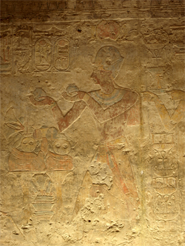 Also moved from Kalabsha was the small Temple of Beit el-Wali. The carvings and paintings within are scenes of the great pharaoh smiting his enemies and gifts from Africa (animals - giraffe, chip, lions, elephant tusks, ostrich feathers and eggs, etc.) and Ramses II, the god. It was very descriptive. |
