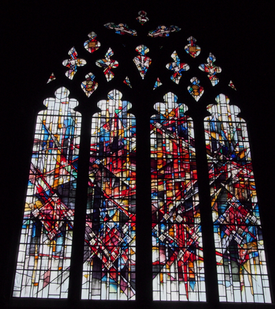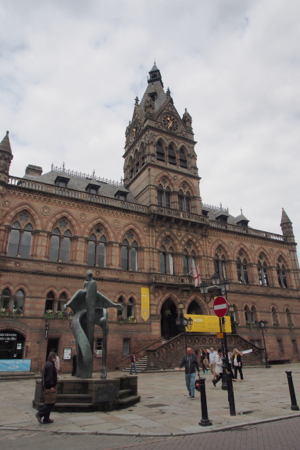 We walked up to the red sandstone cross at the town center. Four Roman roads intersected here and led to the original four Roman gates. The East Gate has a fancy clock and ironwork that was installed in 1899 in celebration of Queen Victoria’s Jubilee that was the year before. The magnificent Town Hall is now government offices and the tourist information center and across from it is the wonderful, huge, red sandstone Chester Cathedral. It is gorgeous, like the cathedrals in Italy. The organ has some 5,000 pipes and there are weekly organ recitals, but not while we were there. There is a mix of modern and old stained glass windows and a fancy carved choir section.