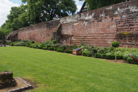 We went up on the city wall and walked down to the East gate to see the East Gate Clock and then went on to the Roman ruins. We looked down on the “largest and most elaborate Roman amphitheater in Britain” and then walked down to it. Men dressed as gladiators were taking school classes through the paces of a Roman army. Each kid had a shield and formed lines and then a phalanx. It was quite cute and educational. We also walked into the Roman Garden, which was once a Roman bath and palestra.
