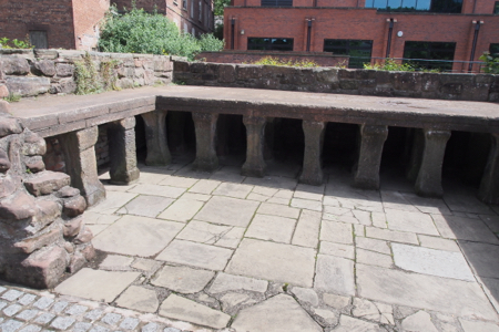 Liz took us on a quick tour, using the whispers. We started at the Grosvenor Shopping Center, a modern three-story mall with all the usual brand name stores – and free WCs. We walked Bridge St., a pedestrian street with second story shops called “the Rows.” In Victorian time (19th c.), deliveries to shops came on the ground level where the muddy streets were full of horse dung and slop poured from the upper floors of living spaces. The shops then were built on the level above the street and connected by a balcony walkway.