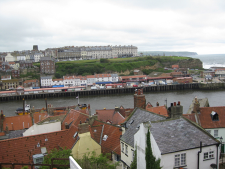 After a lovely drive through the countryside and small towns, we arrived at Whitby, a town divided by the River Esk, which empties into the North Sea. It used to be an industrial town and a wooden ship building port. From 1753 to the 1830s whaling was big. Now it is a town for small commercial fishing and pleasure vacations.