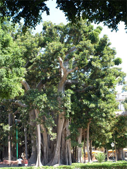 We headed toward some trees and discovered the Piazzo Giuseppe Garibaldi with grass, a fountain, and several beautiful old banyan trees.