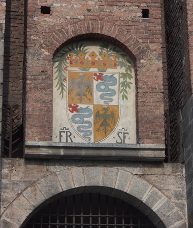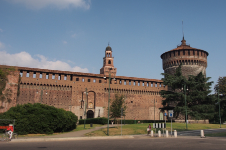 The Sforza Castle is huge! It was a fortress in 1353 and was added onto over the centuries. Leonardo, who was also an engineer, improved parts of the fortress. The castle had a wide moat that is now a grassy area with feral cats who keep down the population of mice, and unused stone cannon balls. We walked into the center of the fortress and then had a 15-minute coffee break (2.20 € for a “cafe Americano” or “long black” – espresso with added hot water).