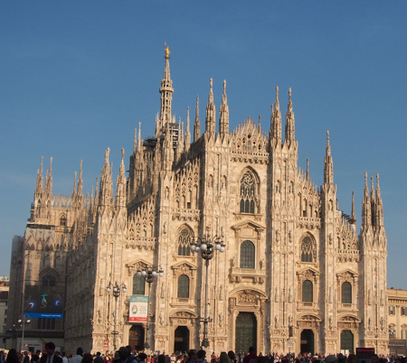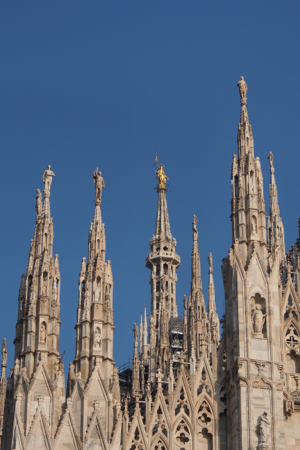 Our tour continued to the fourth largest cathedral in the world, St. Mary of the Nativity. It is built with porous pink vein marble from Lake Maggiore, in the Gothic style, and has many spires each with a statue of a saint on the top. The main spire has a gold Madonna on the top that was added in 1778. We did not get to enter the cathedral.